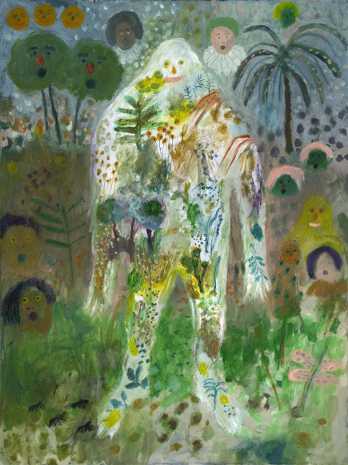 Copyright Michael McGrath. Autumnal Gods Singing, Grouches Lurking Oil, oil pastel, and acrylic on canvas. 40” x 30” (101,5 c 76 cm). Shared with written permission from the artist. | A colorful, dreamlike painting of a tall, white, human-like figure standing in a lush green landscape. The figure’s body is covered with painted plants, flowers, and small natural details, blending into the surrounding grass and foliage. Around the figure are stylized trees with faces, small human faces floating in the sky, and childlike figures on either side. The background is soft blue-gray with scattered circular shapes, and the overall style is whimsical and expressive, with loose brushstrokes and layered textures. I imagine this being saying, “Hi, Erin.”