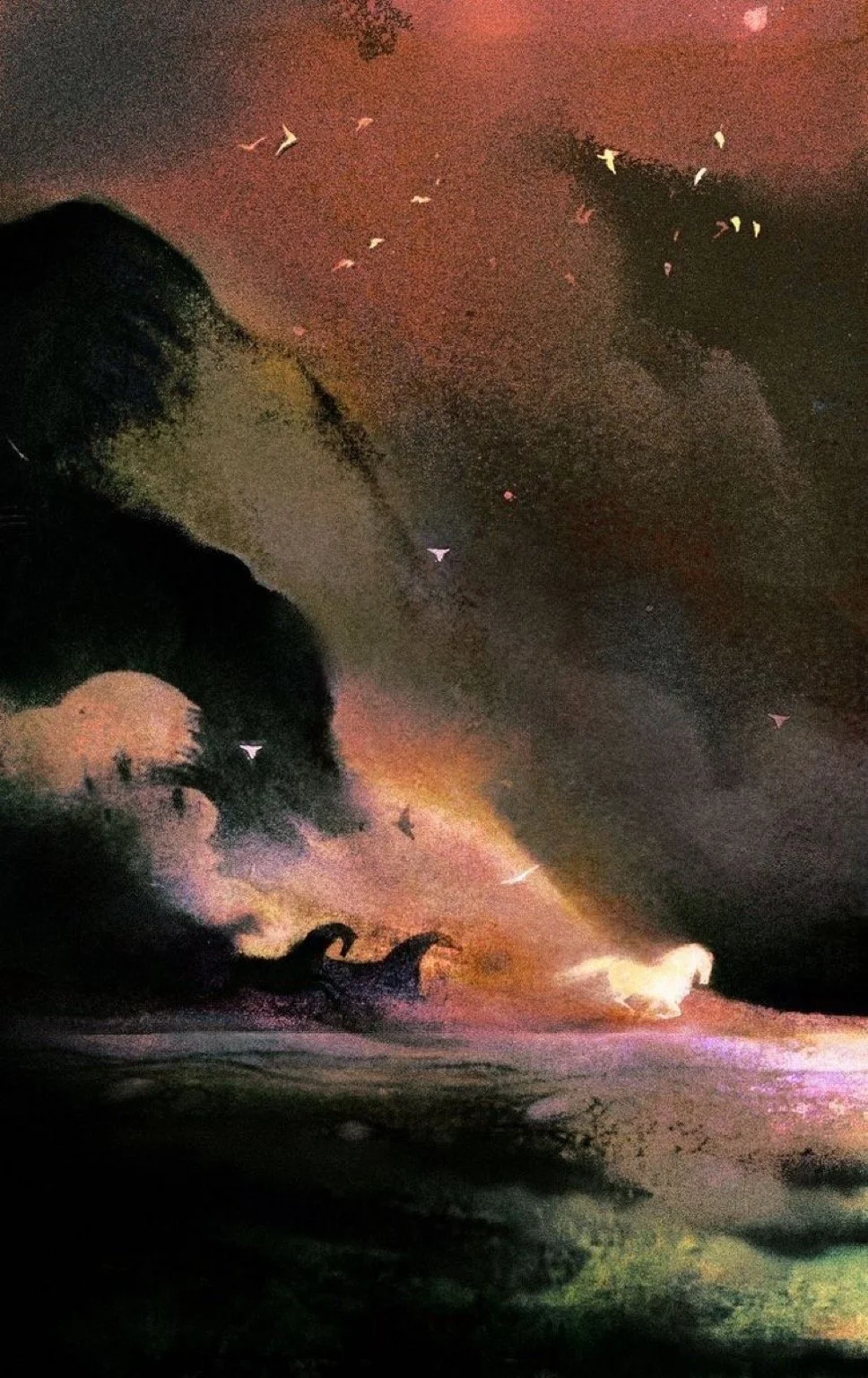 Copyright Michael McGrath. Summer Systems, night search. Oil, oil pastel, and acrylic on canvas 16” × 20”. Shared with written permission from the artist. A dark-haired woman in a pale gray dress rides a vivid pink horse through a field of wildflowers and fire. A gold halo or rainbow radiates behind her. To her left, a volcano erupts. The woman faces away, calmly moving through a burning landscape. The horse glows as though lit from within. The world is on fire.