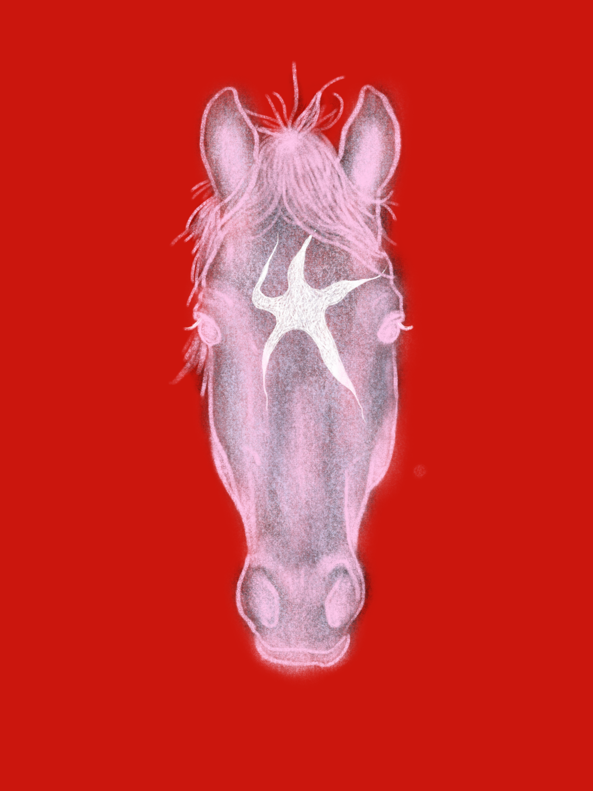 Copyright Paris Rowden. Digital drawing, 2024. Shared with written permission from the artist. A stylized front-facing horse head rendered in soft pink and gray tones floats against a vivid red background. The horse’s bangs are loose and feathery, and a glowing white star-like symbol radiates from the center of its forehead. The horse looks calm and powerful, emerging from the red field like an emblem or spirit figure.