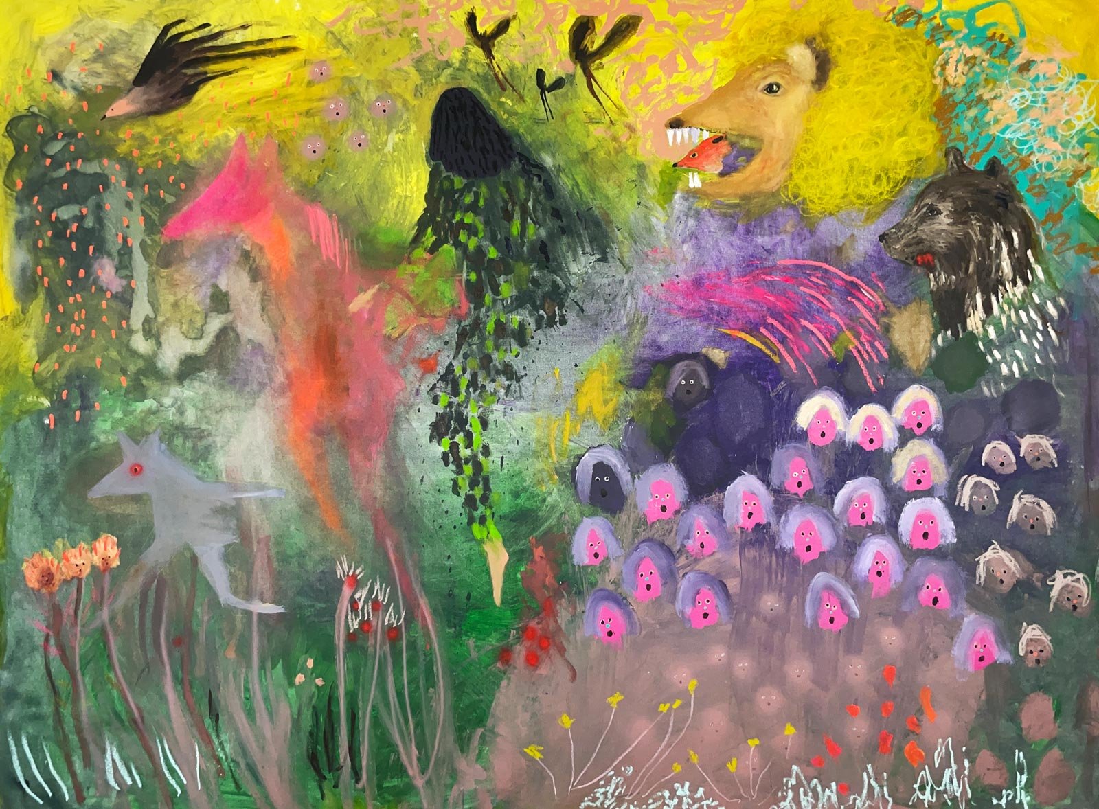 Copyright Michael McGrath. Lions, Witches, and Ghost Gods (2024) Oil, oil stick, enamel and acrylic. 78” x 106” (198 x 269) cm. A large, densely layered painting in vivid yellows, greens, pinks, and purples. The scene is wild and dreamlike, populated by a menagerie of animals and spirit-like figures. In the upper right, a large predator — lion or bear — bares its teeth, mouth open wide, beside a darker wolf or bear figure. A black bird flies in the upper left. A pale, ghostly fox or dog stands in the lower left among thin, bare-branched plants scattered with red berries and small flowers. At center, a dark cascading form — possibly a figure or tree — drips downward like rain or roots. To the right, a crowd of small rounded creatures with bright pink oval faces and wide open mouths fills the canvas, suggesting a chorus or congregation, watched over by dark primate-like figures behind them. Pink slashing marks streak across the middle. The overall feeling is mythic, feral, and alive — a spirit world teeming with voices.