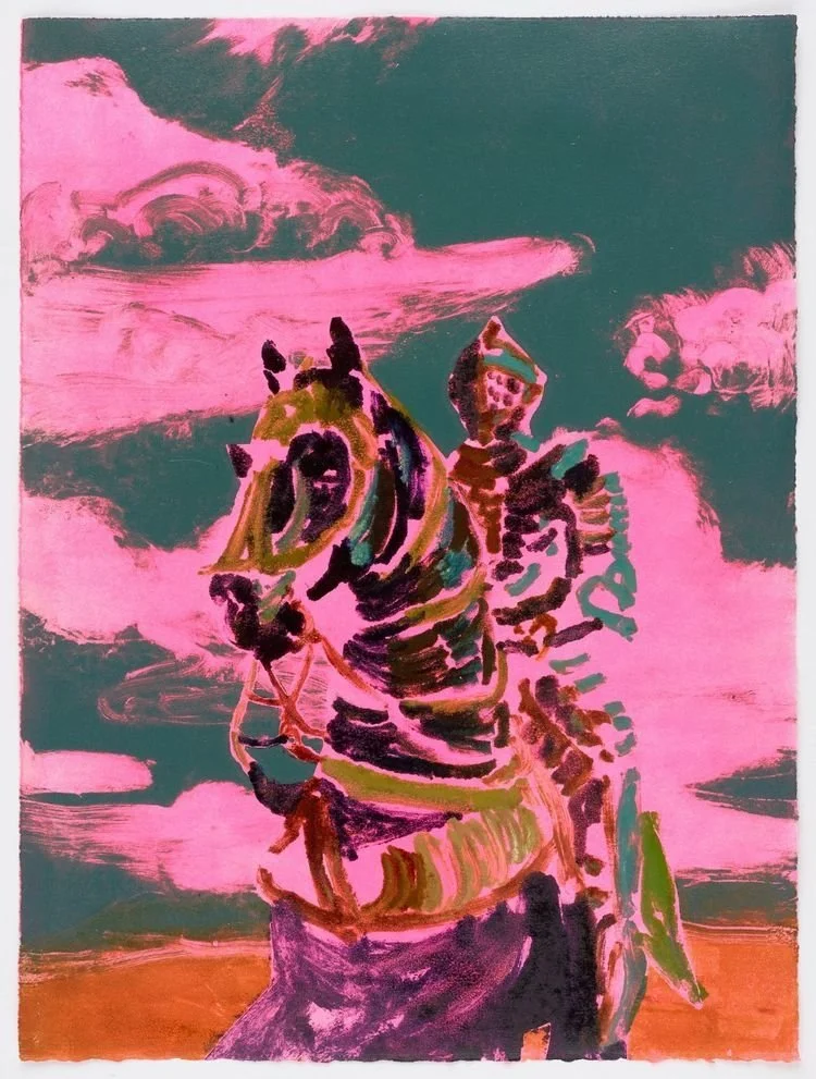 Copyright Rocky Hawkins. VISITING PINK CLOUDS. 24” x 18”, Acrylic on panel. Shared with written permission from the artist. A rider on horseback gallops across a yellow ground against a panel almost completely black with broad brushstrokes. Above, a single pink cloud — thick with paint, impasto, physical — floats in the darkness. The horse and rider are rendered in the same yellow as the earth beneath them, as though they were made of the same substance as the ground. The painting sings with cosmic potentiality. The horse is unmistakably running toward something.