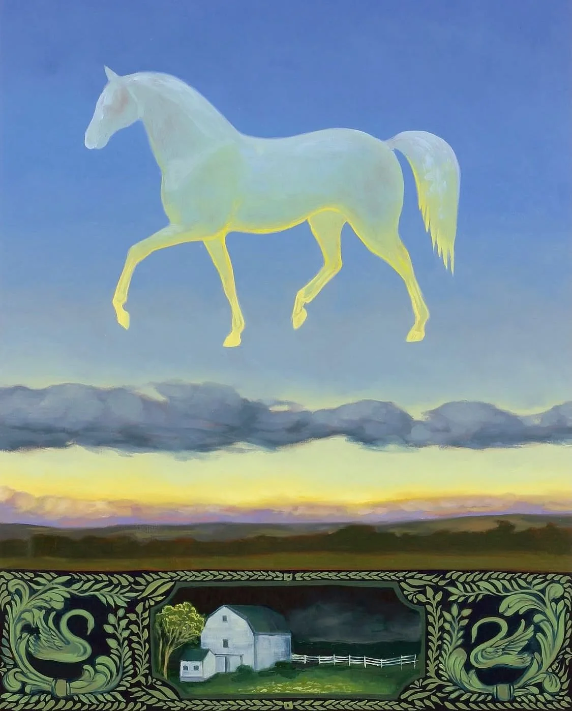 Copyright Audrey Bialke. Under Ever-Changing Skies. Oil on panel, 16 x 12 in, 2025. Shared with written permission from the artist. A luminous white horse, outlined in golden light, floats mid-stride in a twilight sky above an open prairie. Below, a decorative panel in green and black frames a white farmhouse flanked by heraldic swans. The feeling is of a vision — a spirit horse presiding over an earthly place.