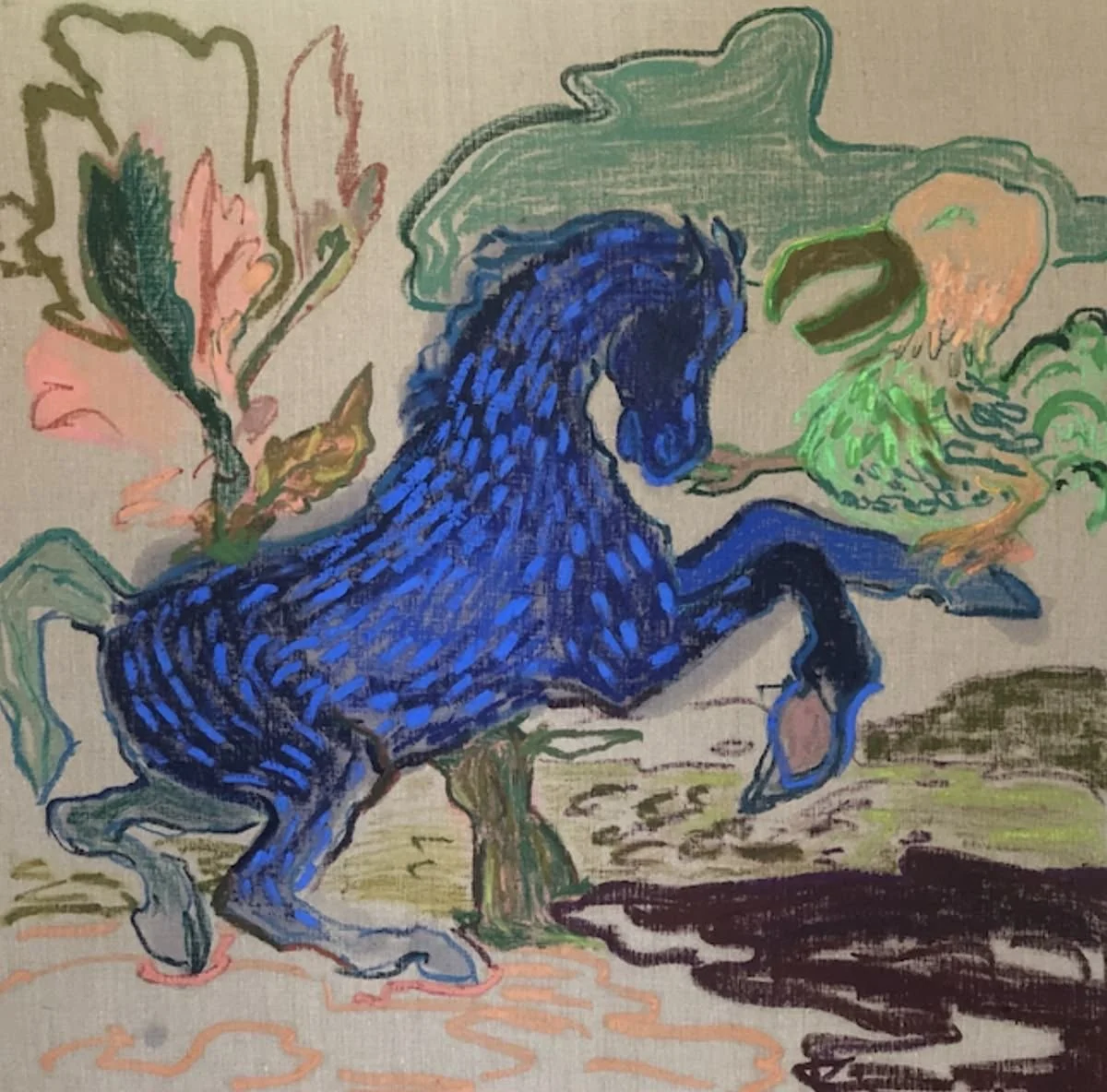 Copyright Patricia Iglesias Peco. The Green Dodo, 2020. Oil on linen on board 36” x 36” Shared with written permission from the artist. An expressive, painterly image shows a deep blue horse rearing up on its hind legs, its body covered in bold, textured brushstrokes of cobalt and indigo. The horse faces a green, stylized Dodo bird with a large beak and soft, feathery shapes, which stands to the right. Behind them are loose, abstracted plants in pink and green, and a pale, neutral background. The ground beneath is loosely rendered with patches of earthy green and a dark, inky shape in the lower right corner. The style is vivid and gestural, with visible crayon- or oil-pastel-like marks and a sense of movement and tension between the two figures.